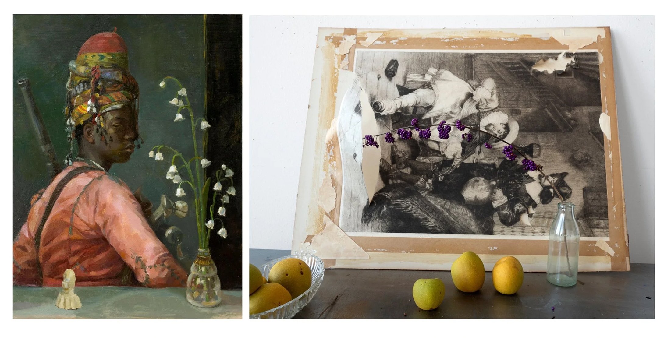 Julie Gearan: Bashi-BAzouk in the Valley, Oil on Panel , 9”x12” Quince, Beauty Berry and Revellers (Wine with Friends), Archival Photograph, 12”x17”