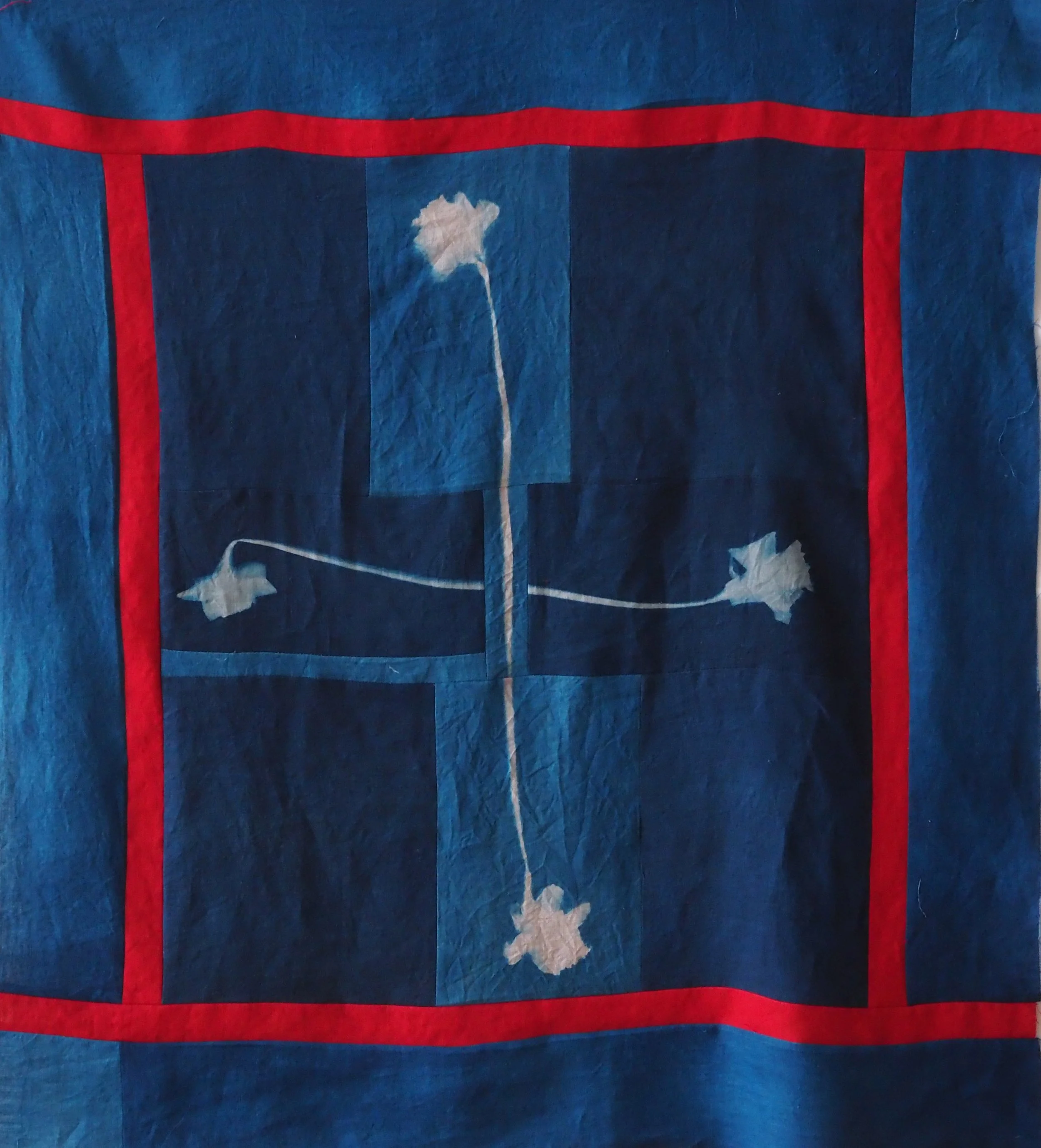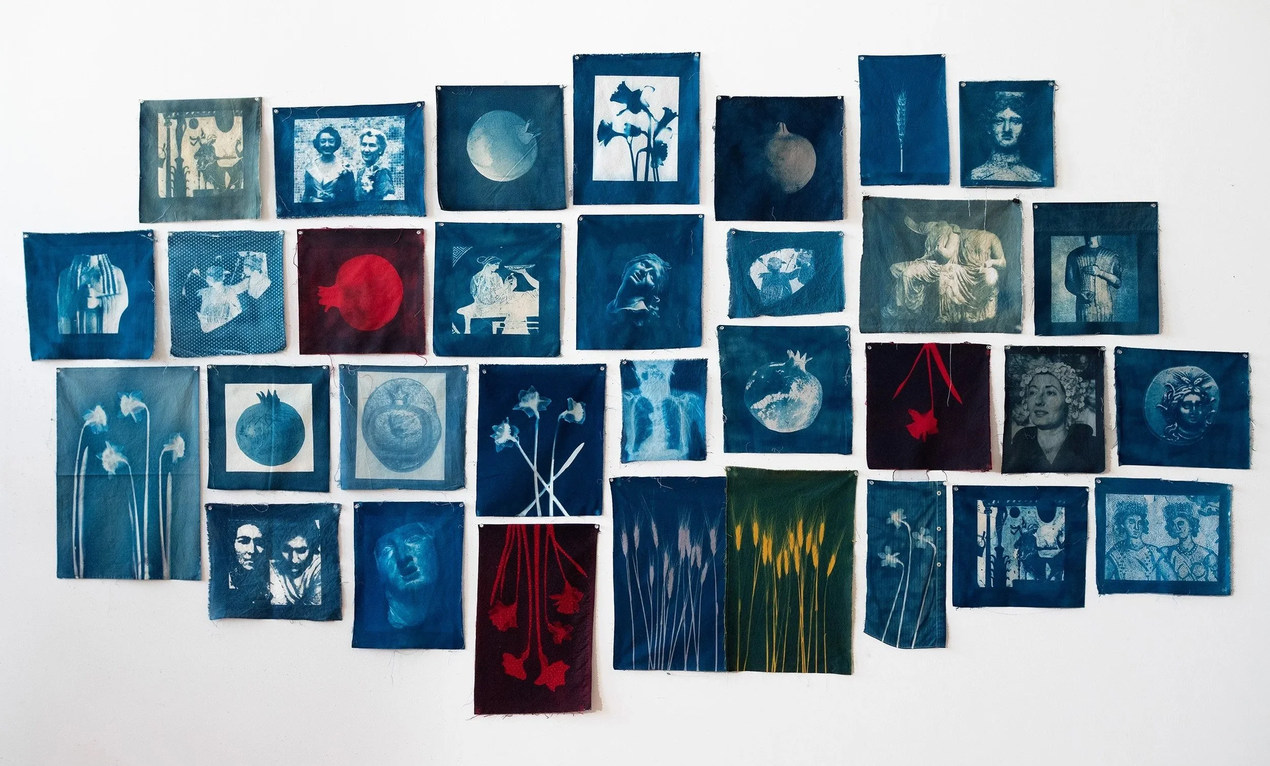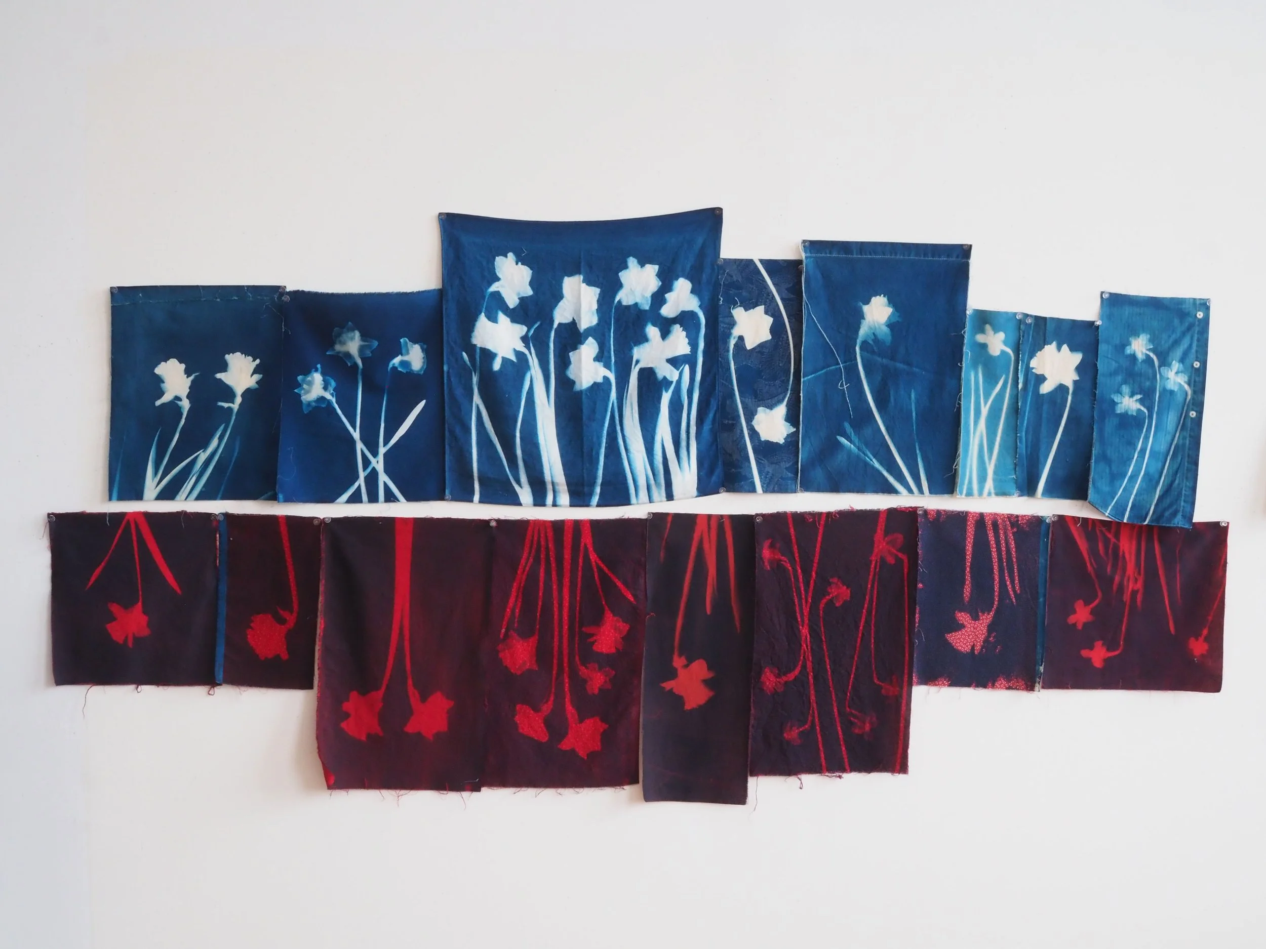 Persephone Splitting Time (Portrait),Unstitched quilt made cyanotypes printed on fabric, variable sizes, shown here 10’x6.5’, 2025