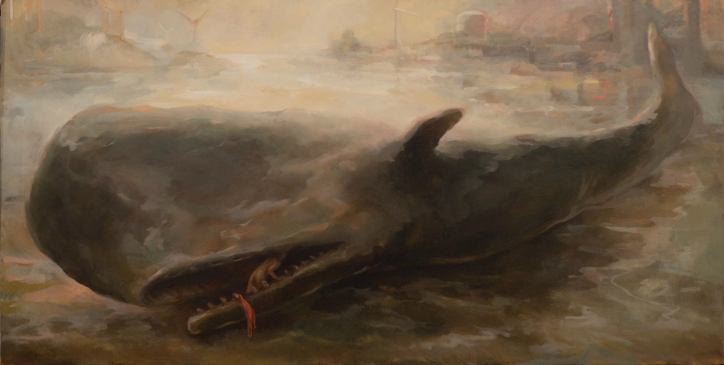 Their shared imagery—the whale, the pomegranate, the swimmer, the underworld, the industrial sea—functions as symbolic architecture rather than literal storytelling. In Tina’s cyanotypes, photograms, and multi-process photographs, forms surface from darkness through contact, light, and transformation. In Julie’s large-scale oil paintings, figures and landscapes hover in a liminal space between dream and embodiment. Both artists employ a kind of metaphoric mise-en-scène, staging moments that echo the emotional and psychological terrain of descent, surrender, resilience, and return.